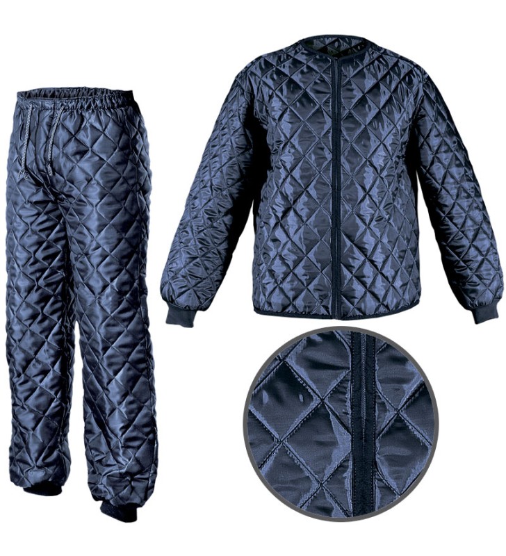 Komplet – bluza sa zipom i pantalone sa učkurom i zipom, obostrano štepani uložak sa elastičnim manžetnama na krajevima rukava i nogavica, koflin 150 g, prikladan za nošenje ispod radne odeće u hladnijim vremenskim uslovima.